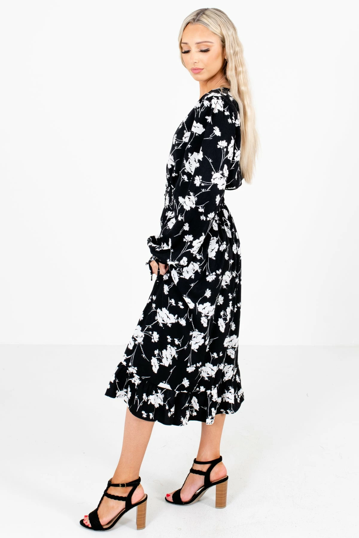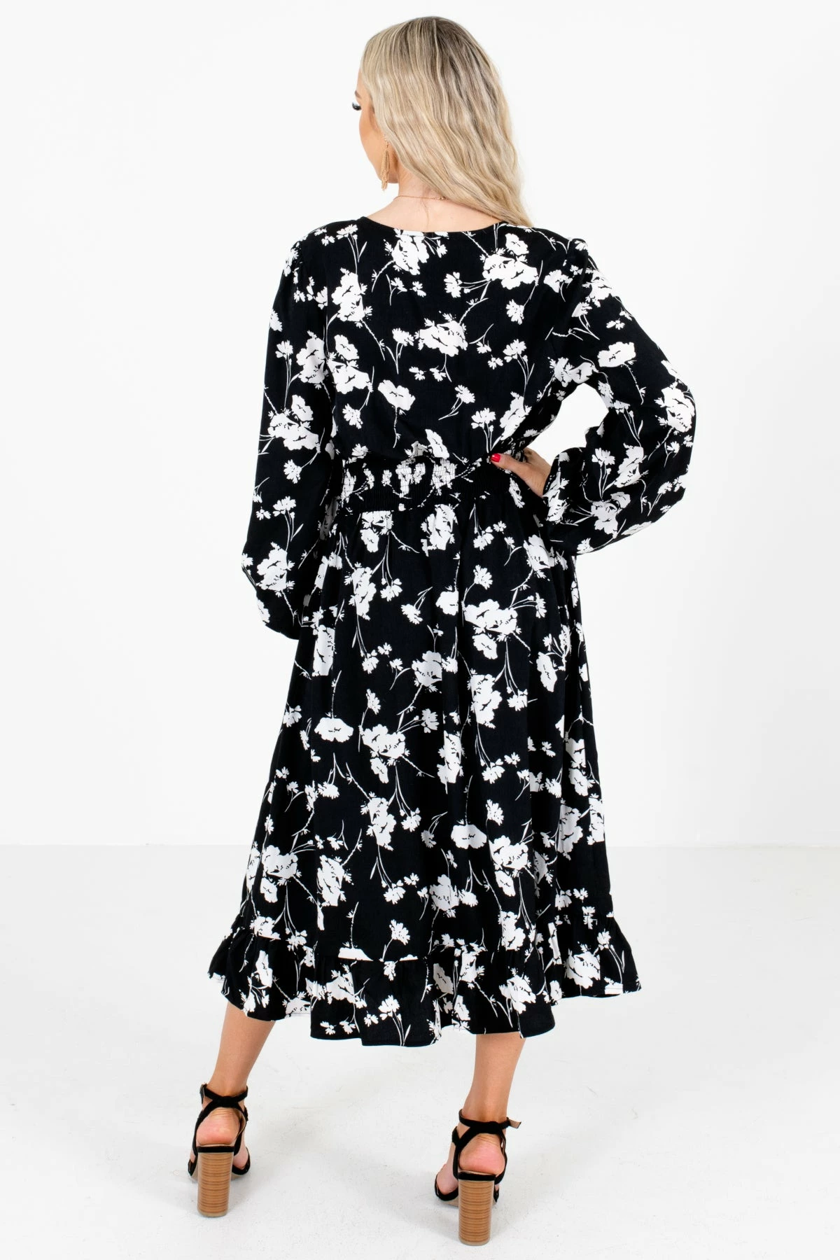 Our new Endless Enchantment Floral Midi Dress is one of a kind! This midi length dress features a white floral pattern. We’re in love with the v-neckline, ruffled accents, and elastic waistband! The lightweight, high-quality material creates a comfortable and flattering silhouette. The self-tie accents on the sleeves perfectly complete the look! Pair our Endless Enchantment Floral Midi Dress with black heels to create a gorgeous outfit like our model’s.