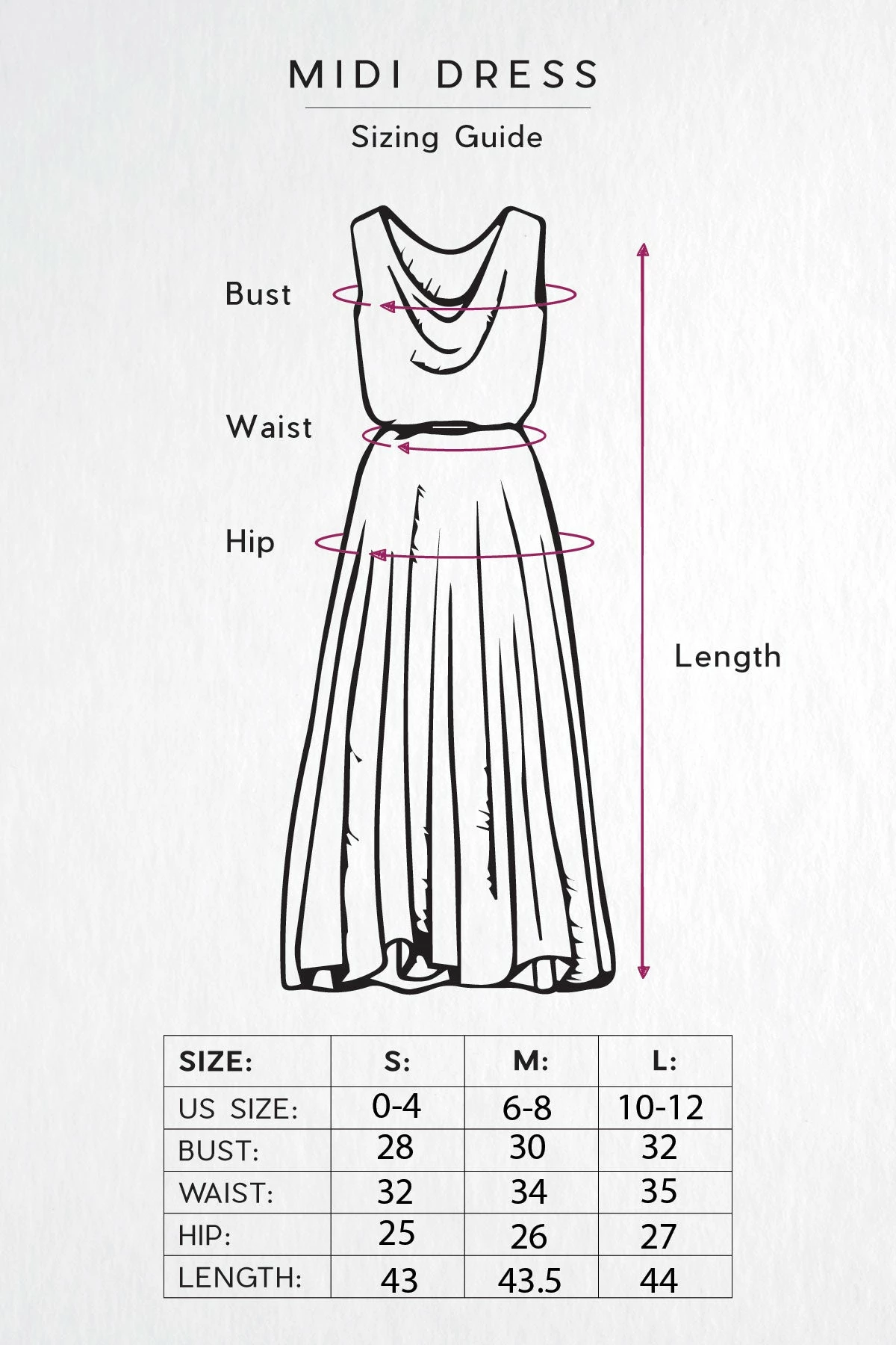 Measurements: US Size Bust Waist Hip Length Sleeve S 0-4 28″ 32″ 25″ 43″ 9.5″ M 6-8 30″ 34″ 26″ 43.5″ 9.5″ L 10-12 32″ 35″ 27″ 44″ 10″ For more information on how to choose the perfect size, check out our size guide.