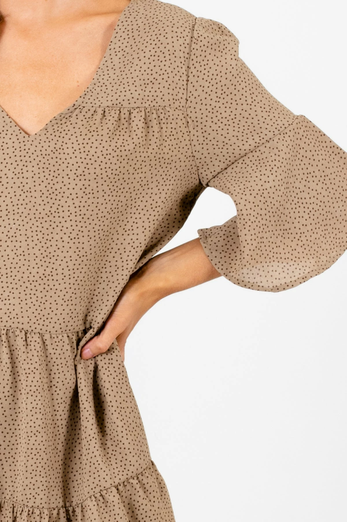 Our new Polka Dot It Mini Dress will quickly become your new favorite piece! This gorgeous dress features a polka dot pattern. We’re in love with the tiered ruffled style, v-neckline, and 3/4 length sleeves! The lightweight, high-quality material creates a comfortable and flattering silhouette. Pair our Polka Dot It Mini Dress with your favorite heels to creates a beautiful outfit!