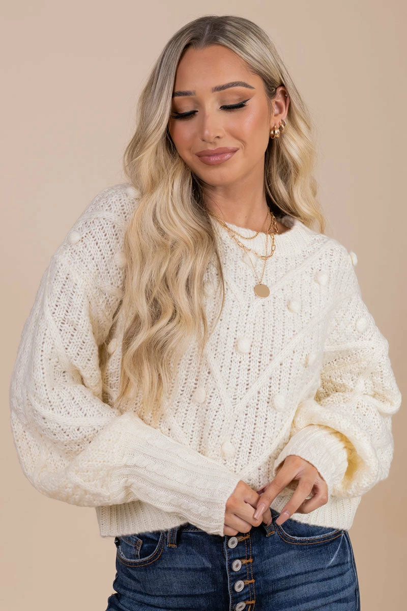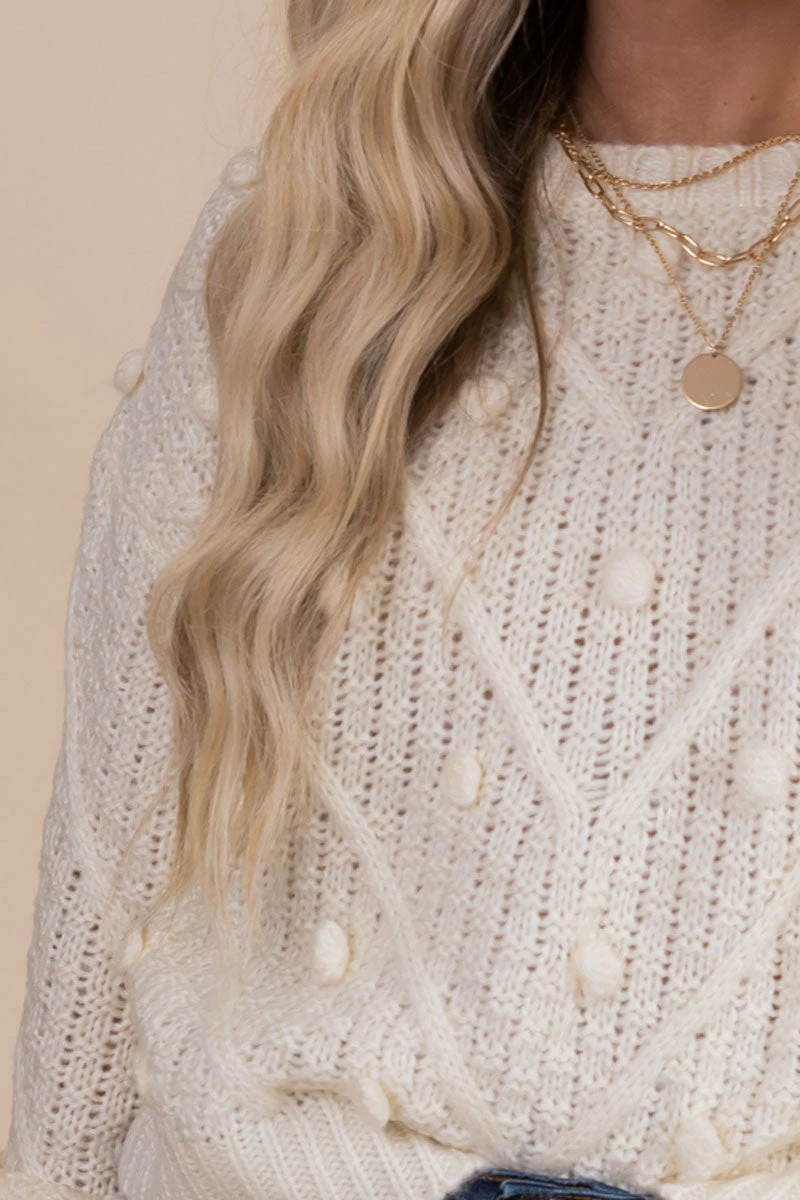 Our Winter Splendor Textured Knit Sweater is a fall must-have! The long puff sleeves, semi-cropped length, and two color options make this sweater perfect for anyone! The textured dot details and knit material will keep you stylish and warm all season long!