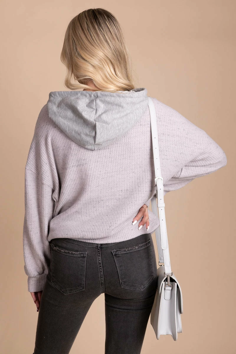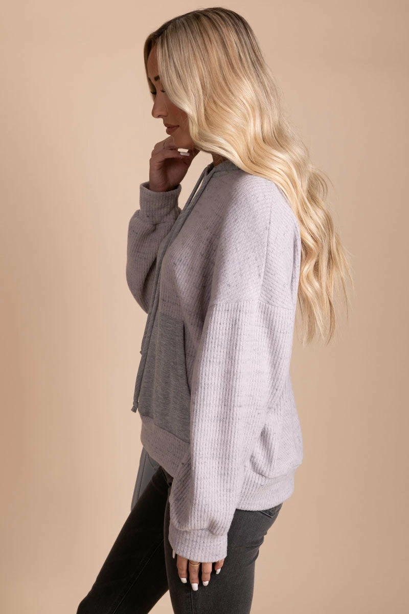 Our new Be Iconic Drawstring Hooded Sweater is a fall must-have! This hooded sweater features a light lavender purple color with a gray hood and front pocket. The long sleeves and warm material makes this perfect for chilly fall weather! Pair your Be Iconic Drawstring Hooded Sweater with your favorite jeans and booties for an iconic fall outfit.