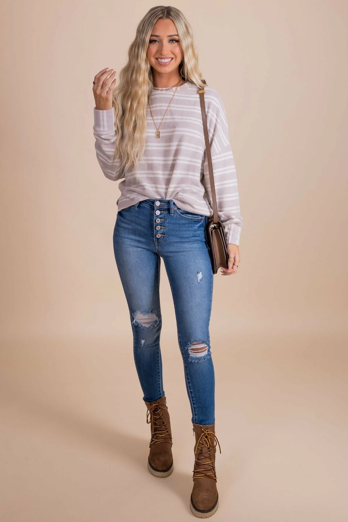 You’ll fall in love with our new Comfort Zone Striped Sweater! This top features a classic round neckline and striped pattern. The comfortable, soft material makes this top so fun and cozy and easy to wear! Pair your Comfort Zone Striped Sweater with your favorite jeans to create a cute fall outfit!