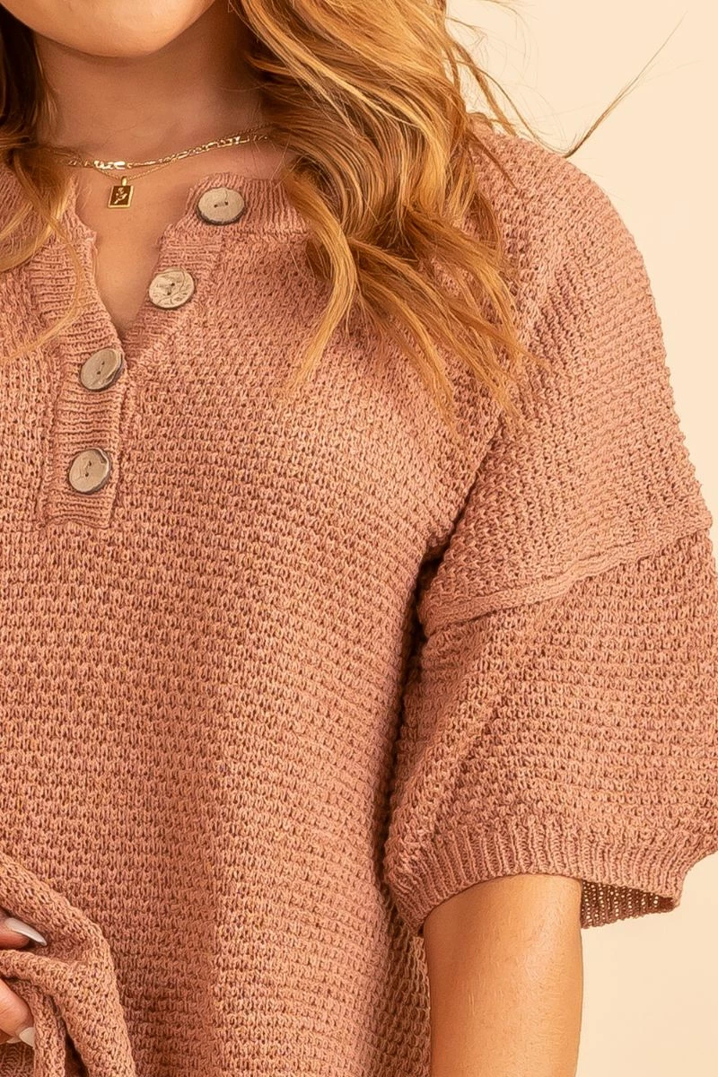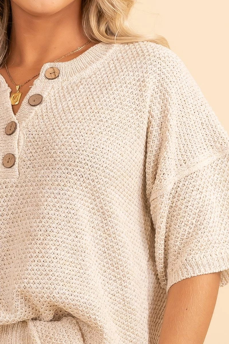 Our new Keeping It Real Top and Bottom Knit Set is to die for! This two-piece set has the perfect sweater knit material that is so cozy and cute. The top has a button up v-neck and short sleeves! This set is a relaxed fit and very comfortable.