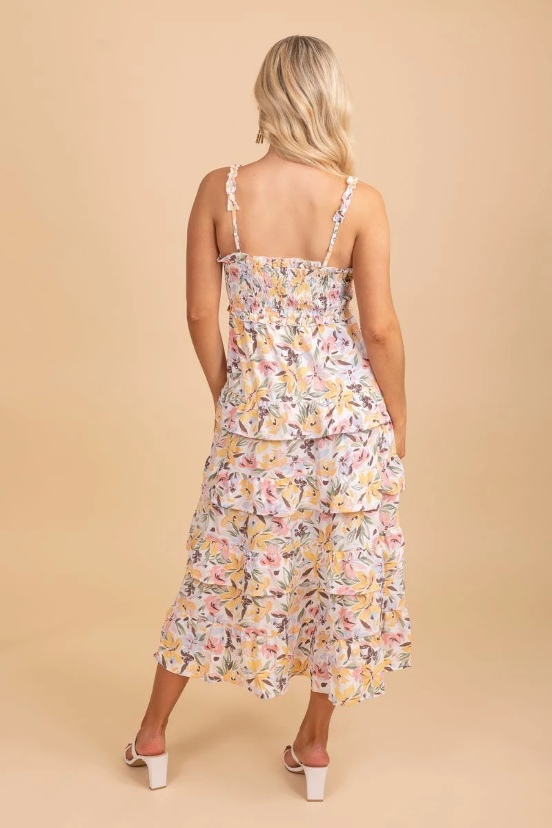 Our Let The Sun Shine Floral Midi Dress is a must-have! This stunning dress features the cutest multi-color floral print, ruffle details, and the most comfortable high-quality material. We are in love with the flowy fit and smocked top.
