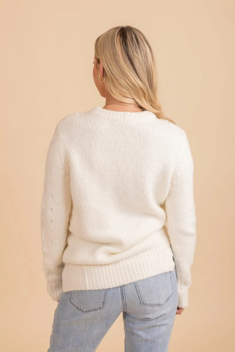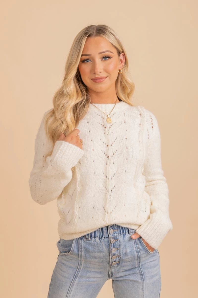 Our Loving More Lace Knit Sweater is a wardrobe must-have! This sweater features the cutest white color, long sleeves, and lace knit details! The warm knit material will keep you comfortable and cozy all season long!
