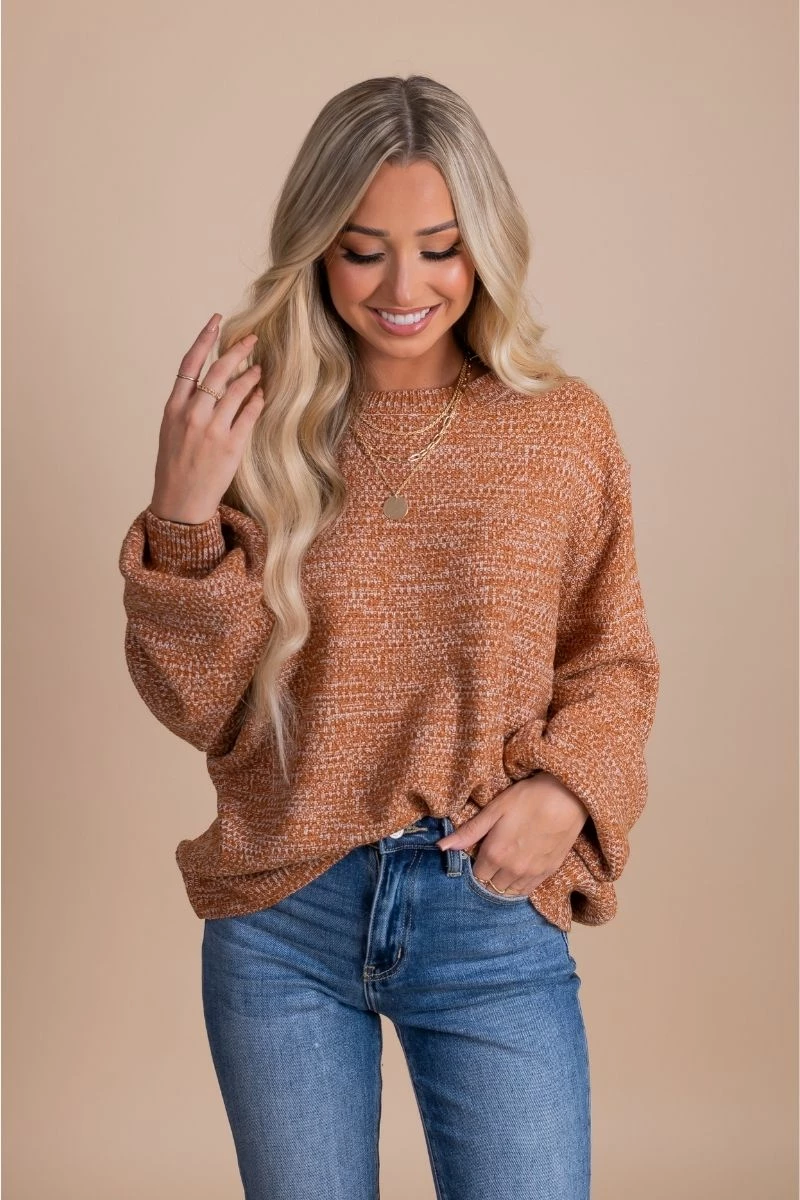 Our All The Right Things Balloon Sleeve Sweater is a wardrobe must-have! This sweater features a gorgeous brown orange color, long balloon sleeves, and marbled details! The cozy knit material will keep you comfortable and warm all season long! Pair your All The Right Things Balloon Sleeve Sweater with your favorite distressed jeans and sneakers to create a cute and casual outfit!