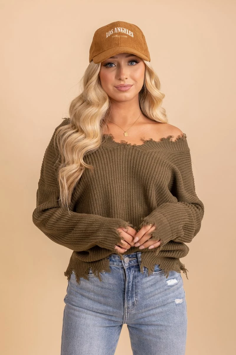 Our new Autumn Moon Distressed Sweater is so cute! We’re so in love with the off the shoulder look, distressed edges, and v-neckline! The 2 color options are perfect colors for this upcoming season! This sweater will keep you warm, cute, and cozy all season long!