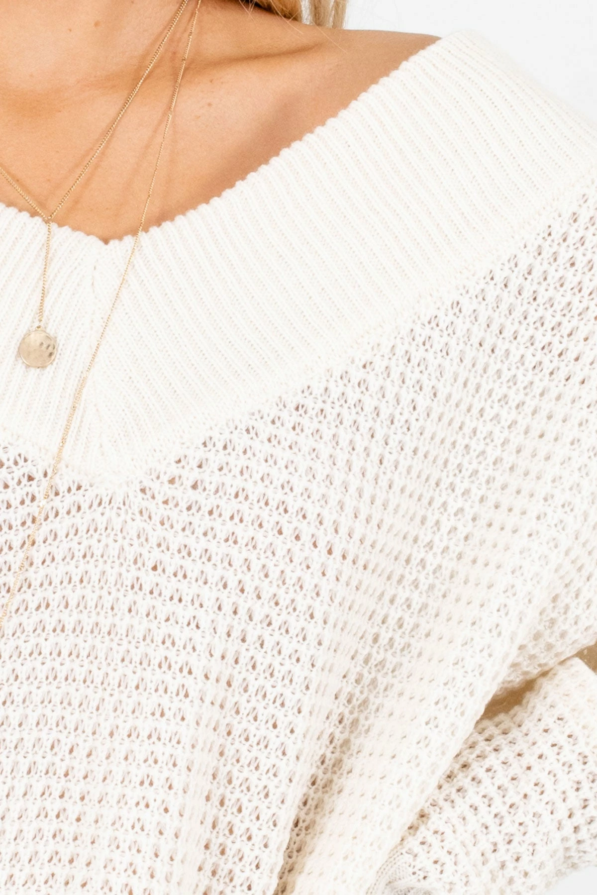Our Back in Town Cream Knit Sweater is composed of 100% Acrylic. Hand wash cold. Hang or lay flat to dry. Please do not bleach.