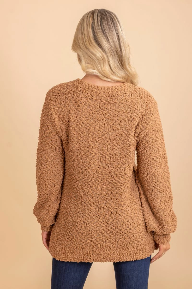 The In a Don’t Mention It Popcorn Knit Sweater is composed of 78% Polyester 22% Acrylic. Hand wash cold. Hang or lay flat to dry. Please do not bleach.