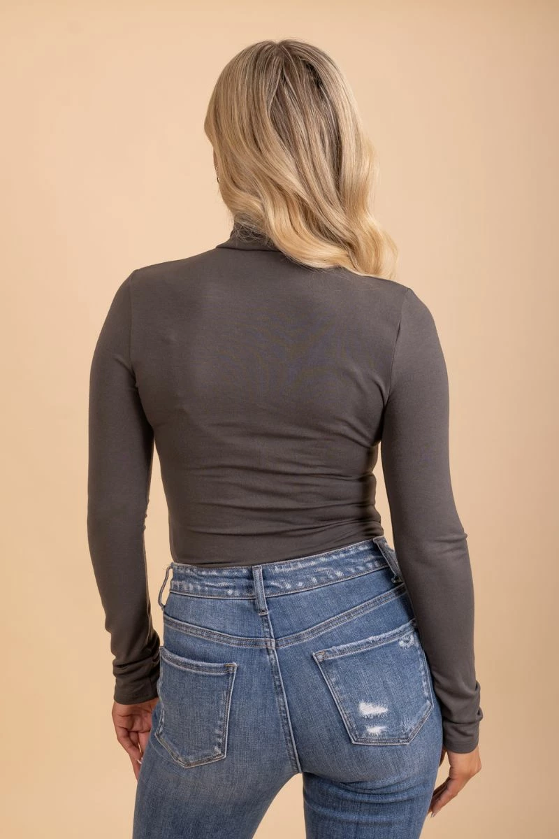 Our Keep It Fierce Long Sleeve Turtleneck Bodysuit is must have! This bodysuit features long sleeves and a high rise turtleneck. It is form fitting and is very flattering! It also comes in the softest material that will keep you cute and cozy all day long!