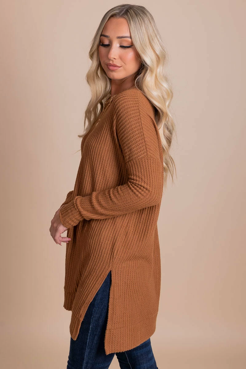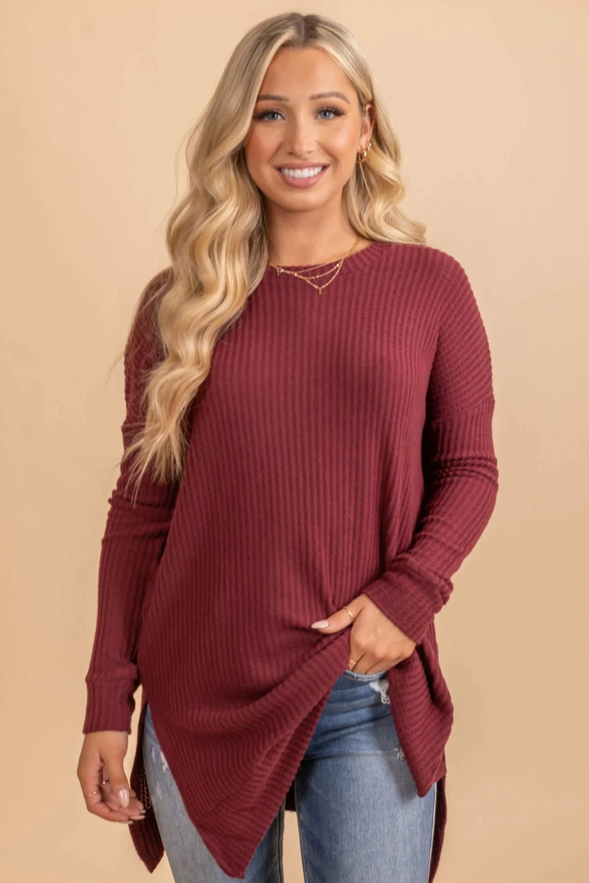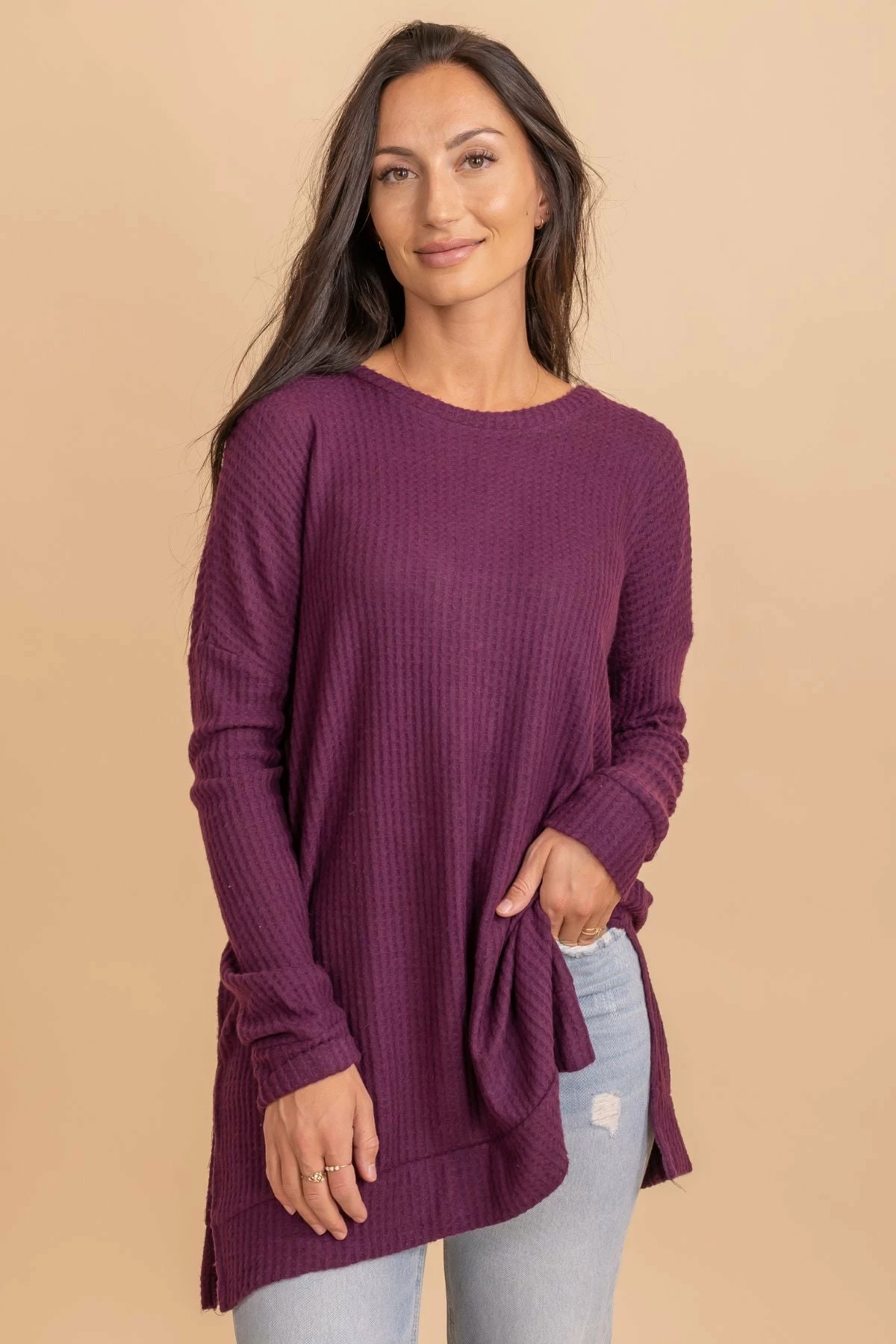Our Life Goes On Long Sleeve Waffle Top is a fall must-have! This tunic top features long sleeves, a split hem, and comfy oversized fit! The round neckline, cute fall colors, and waffle textured details make this top so easy to wear all fall long! Pair your Life Goes On Long Sleeve Waffle Top under a layering piece or wear it on it’s own this season!