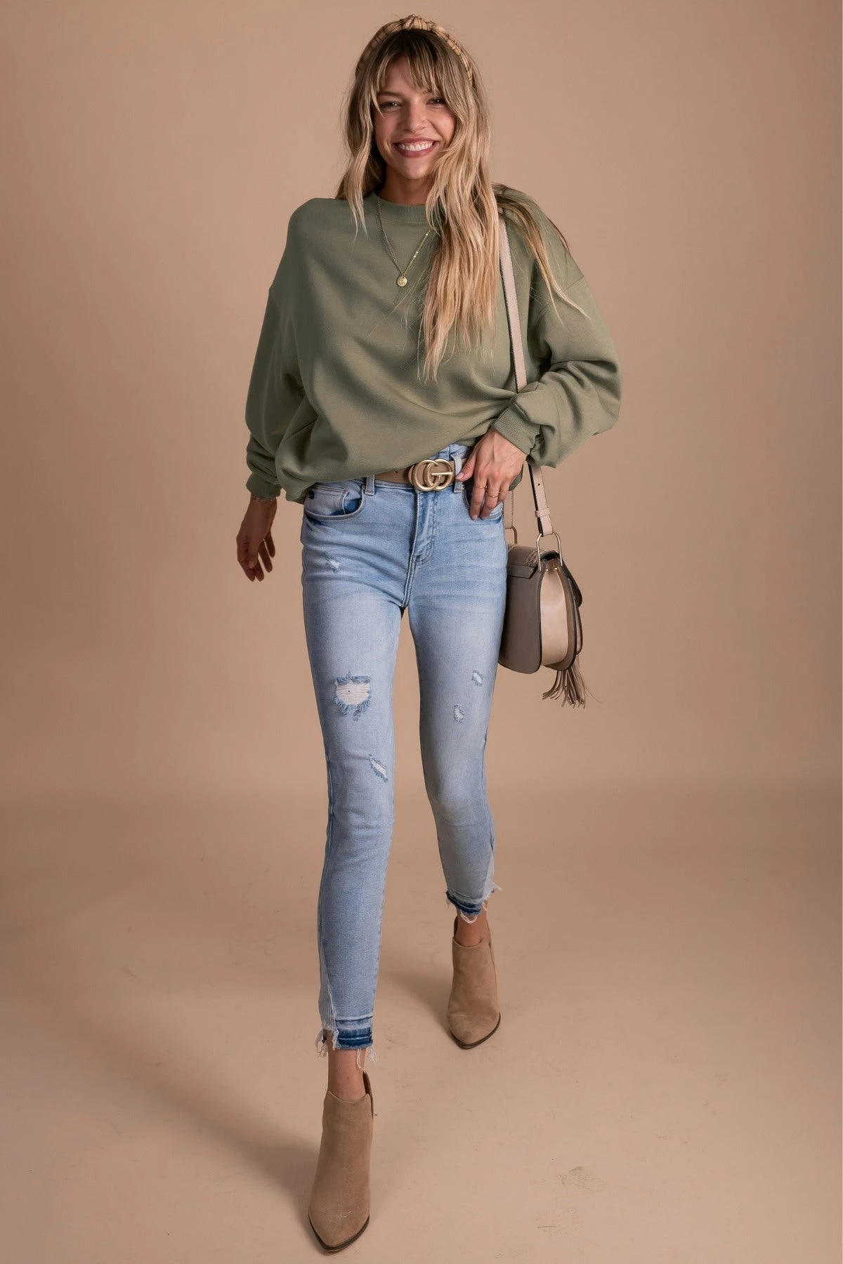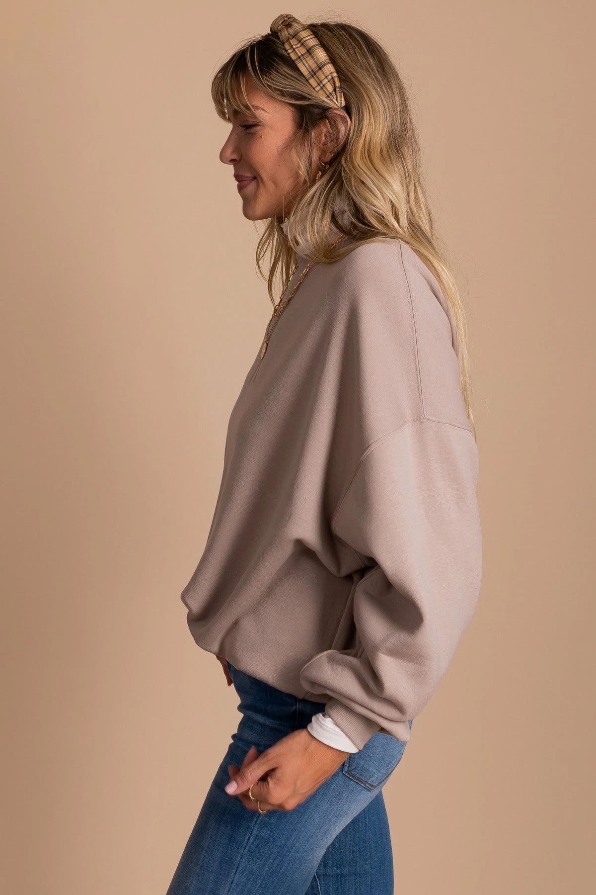 Pair your So Casual Fleece Crew Neck Sweatshirt over your favorite turtle neck to recreate our model’s outfit.